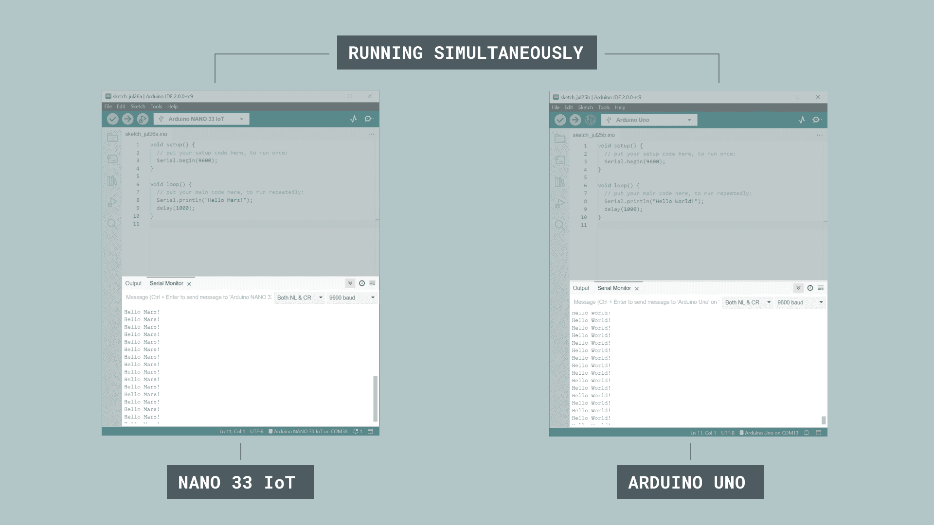 A really cool feature with the Arduino IDE 2 is that the Serial Monitor is linked to the sketch windows you have open. For example, if we have two sketch windows, named sketch_1 and sketch_2, we can select the port and board for each window, and have two Serial Monitors running at the same time.