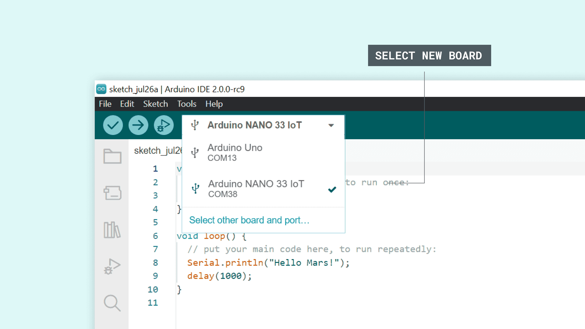 5void loop() {6Serial.println("Hello Mars!");7delay(1000); 8}