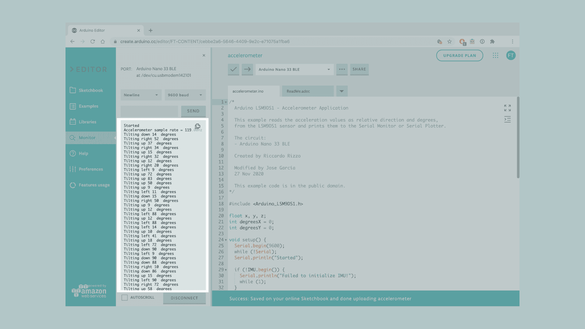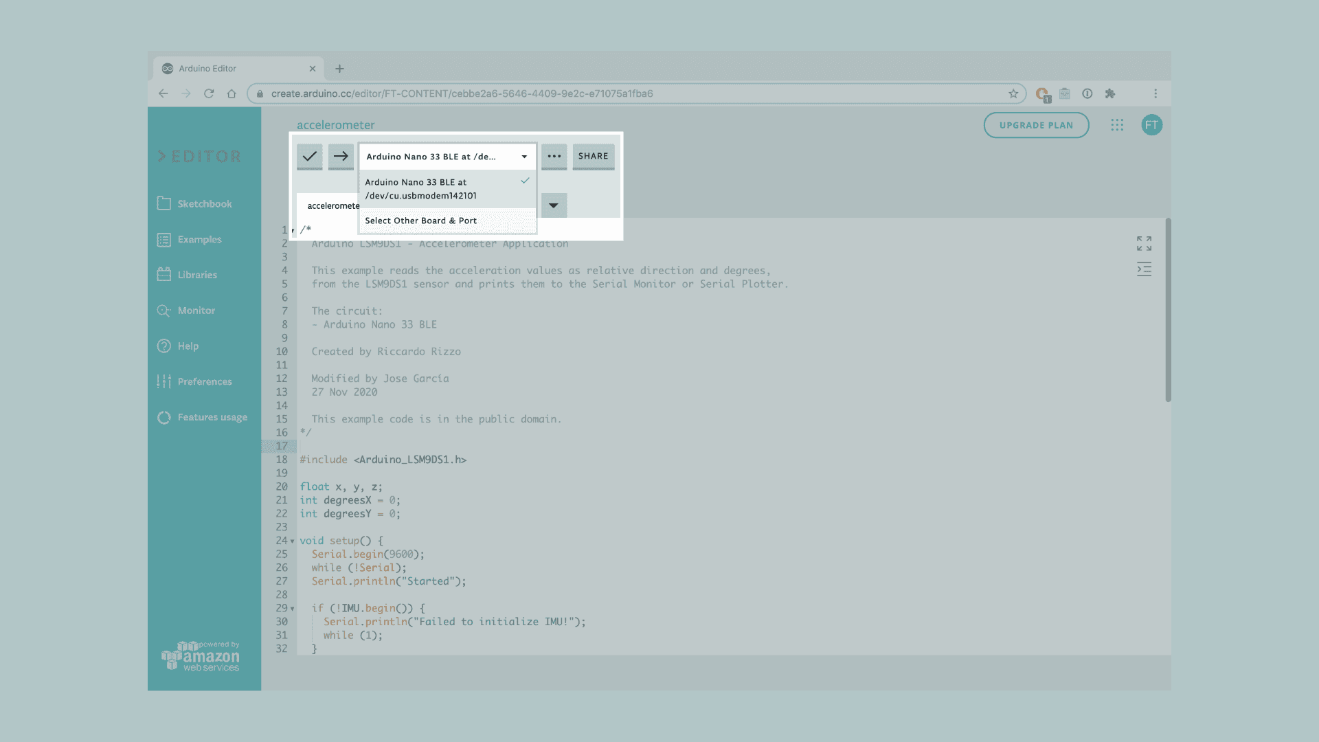 Let's start by opening the Arduino Web Editor, click on the Libraries tab and search for the LSM9DS1 library. Then in > Examples, open the SimpleAccelerometer sketch and once it opens, rename it as Accelerometer.