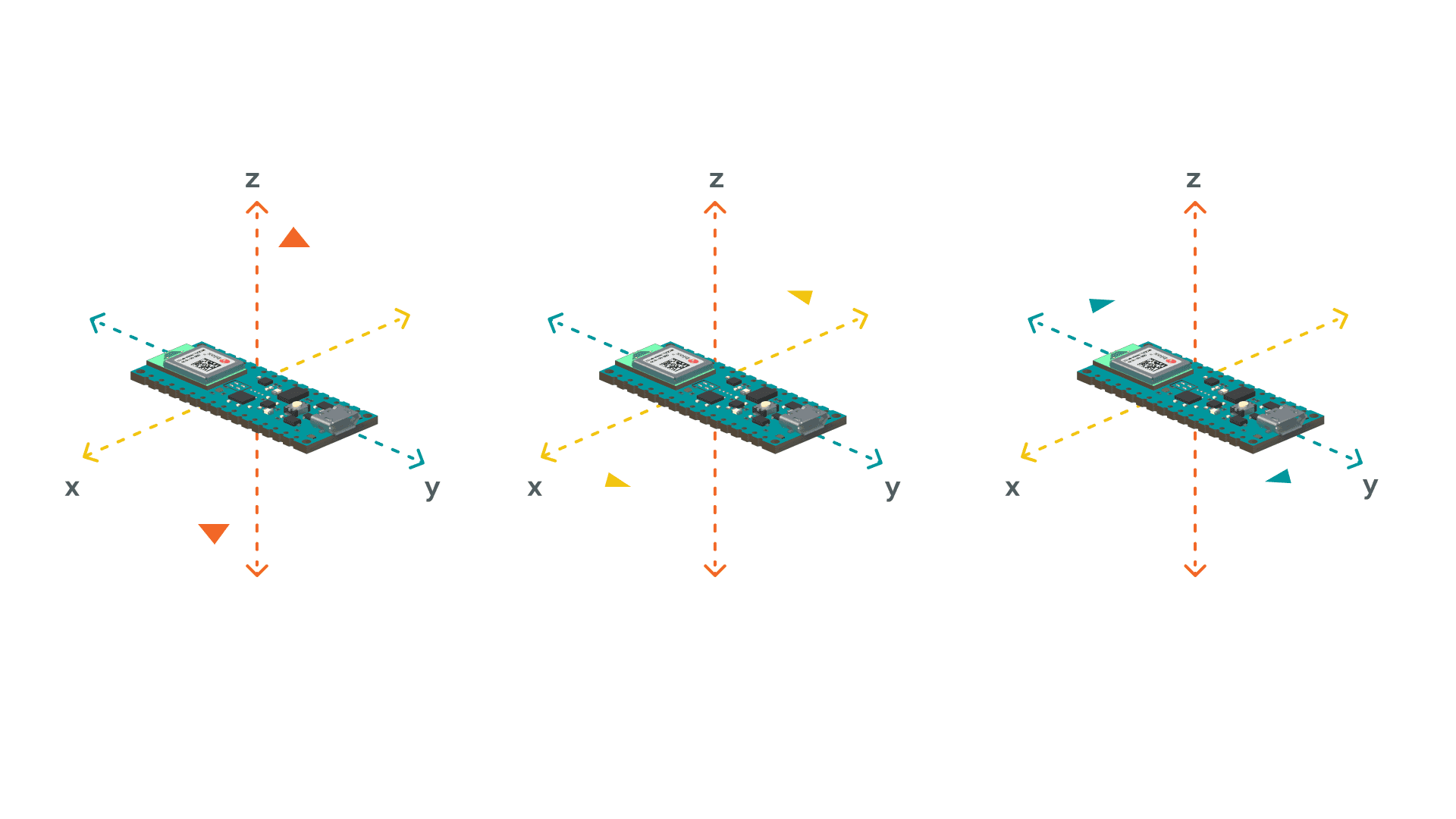 In order to get a correct reading of the board data, before uploading the sketch to the board hold the board in your hand, from the side of the USB port. The board should be facing up and "pointing" away from you. The image below illustrates the board's position and how it works: